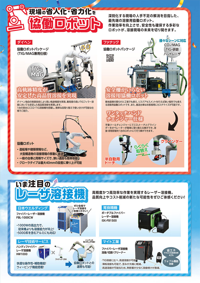 「群馬ウェルディングフェスタ」は、研削&研磨などの消耗品から作業工具、環境改善商品、協働ロボットや今話題となっているファイバーレーザー溶接機など、溶接・板金・鍛圧機械を取り扱っているメーカー約100社が集結、最新の製品を展示・実演しています。
