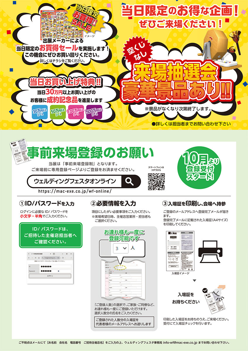 弊社担当スタッフが代理登録を行い、入場証をお持ちさせて頂きますので、是非お出掛けください。